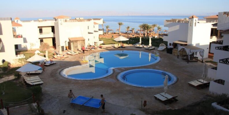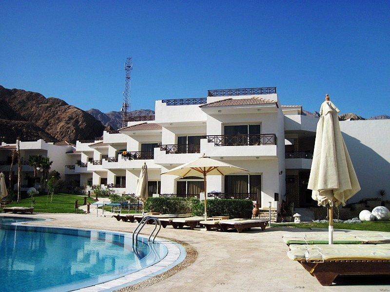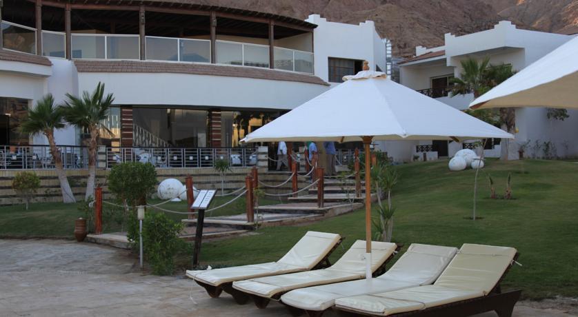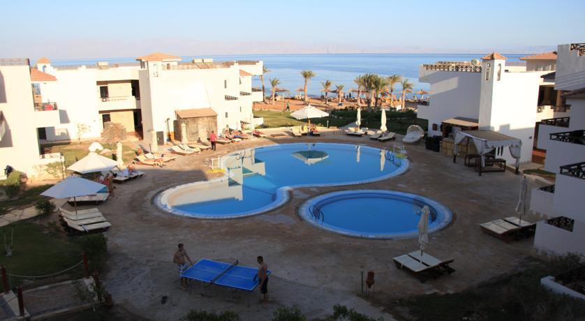 Ездили в Египет впервые. Дахаб в целом и отель в частности - нуднейшее место! Если бы не подводный мир, от тоски бы завыли, конечно. Ехали специально с масками понырять. Кстити, обувь специальную для кораллов с собой привезли, втридорого приобретенную, а не месте она стоит 5$, так-что не заморачивайтесь, купить лучше в Дахабе (без неё - никак). Отель на 4* не тянет даже с большой натяжкой. Средненькая 3. Поселили вначале в номер со сдвинутыми полуторными кроватями, грязноватыми шторами, ржавой сантехникой и терассой (1 этаж), выходящей на стройку.... Не смотря на сунутые в паспорт 10$. Попросили поменять на другой номер, лучше на 2-ом этаже, "обранили" на ресепшн еще 10$ и нас поселили в ГОРАЗДО лучший номер на 2-ом этаже, с боковым видом на море. Так-то лучше!