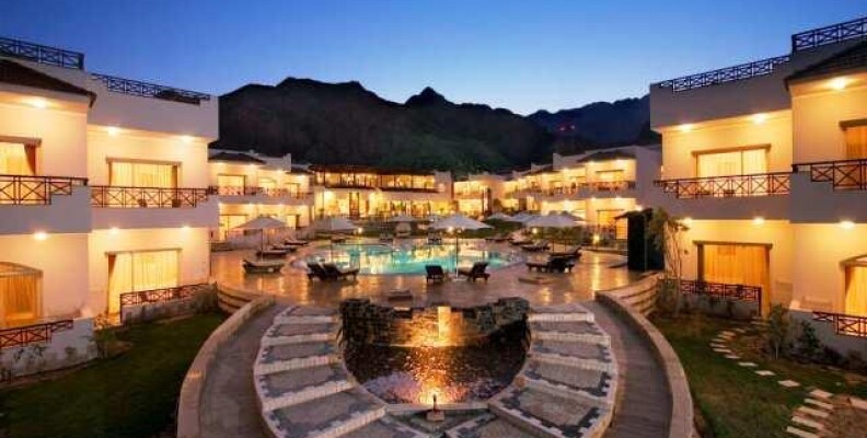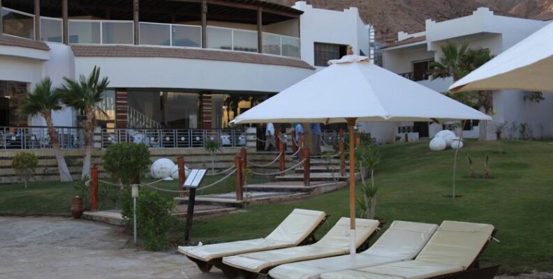 Ездил я по Дахабу и смотрел отели,но мой мне понравился конечно больше всего.Огромный его плюс-это расположение.Стоит прямо у подножия Синайских гор-это такая красота!Вечер начинается тут рано-в 4 часа солнце садится.Пляж конечно никакой.Берег в камнях и заходить в воду трудно,но есть пантон,с которого все и прыгали в воду.А море действительно Божественно.Виден каждый камушек на дне и рыбки...это вообще фантастика.Красивее я не видел конечно.