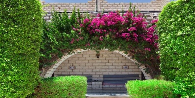 Территория отеля очень большая и красиво оформлена деревьями и растениями.