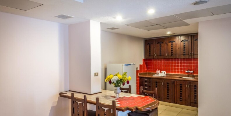 В этот раз заказан был одноместный номер. При заселении на рецепшн предлагали за бакшиш номер получше, но в чем именно он будет получше толком сказать не смогли, поэтому не убедили. В результате поселили меня в апартаментах № 150 с двумя спальнями и кухней, телевизором и большим холодильником. Просто у них там все номера такие. И такой же номер приехавшей со мной тоже одиночно русской туристке – она тоже ничего не давала. По телевизору у мен было 2 русских канала, у соседки – только один. Холодильник я выключила чтоб не гудел, т.к. все равно держать мне в нем было нечего.