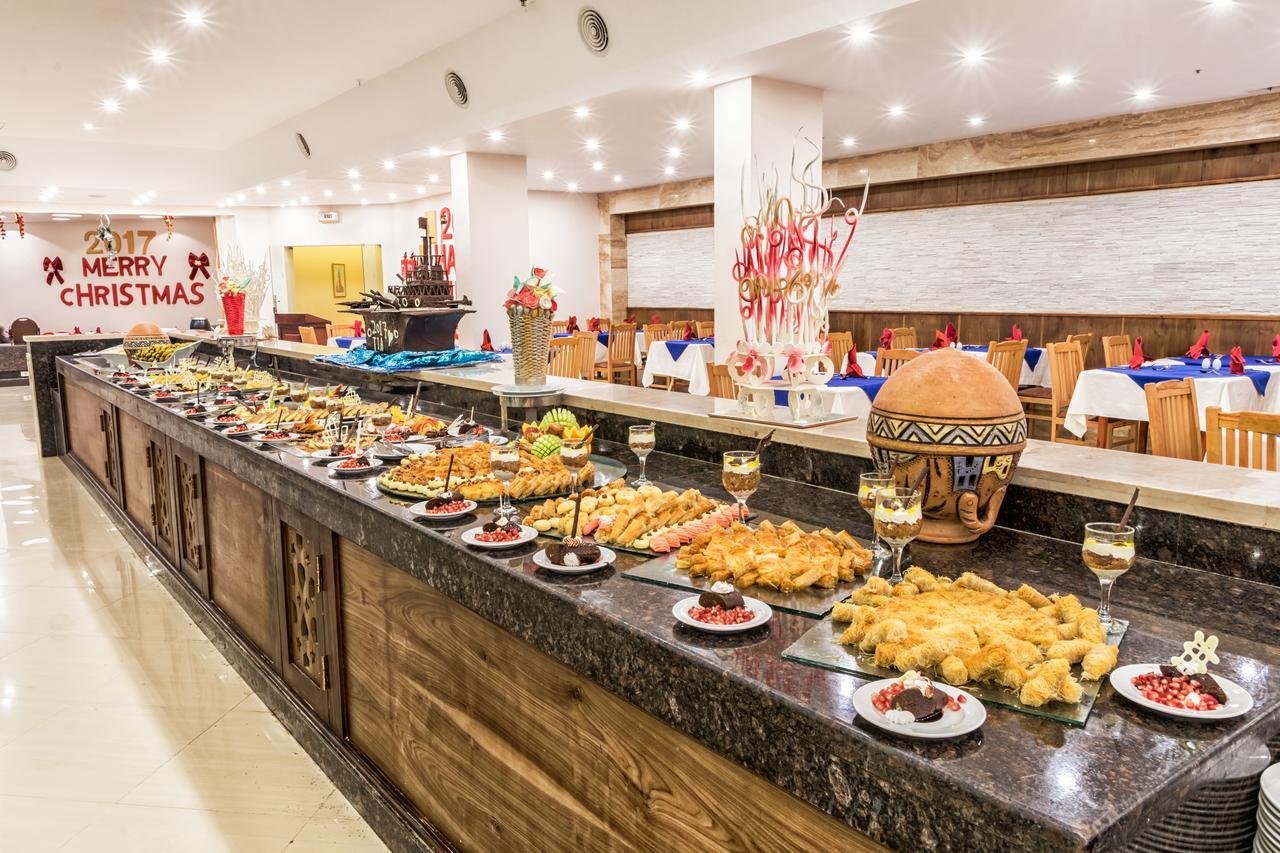 В ресторанах питание как и везде в Египте, без изысков, но голодным не останешся. Пару раз был арбуз и персики, но почему-то накладывали лимитированно, система всё включено - курит. В баре на пляже лимит на пиво, больше 4 стаканчиков пластиковых не дают. Стаканчики 100 грамовые, вообщем смех да и только, на жаре этот стаканчик за один глоток уходит, поэтому за пивом всегда очередь. Зато отличные бары в холле основного здания и в главном ресторане, а бармены вообще профессионалы и молодцы таким не жалко было и чаевые дать. Ещё не плохой бар где дискотека, но там громко музыка играет и бармены не всегда могут вас услышать, но это не их вина, а так всё гут. Алкоголь не айс. Пиво как будто разбавили водой, хотя и наливают из бутылок. Брали 1 раз ром и 1 раз бренди, Египетский, по $5 за бутылку, разочаровались, вода водой, даже пить противно, оставили не допитым в номере.