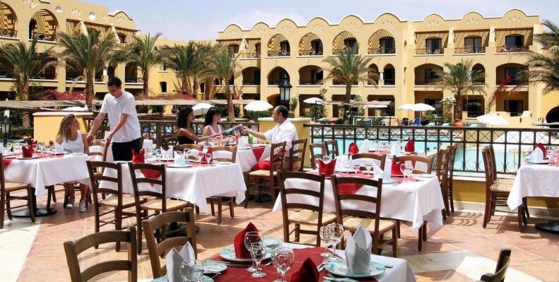 6. Сервис в отеле выше всяких похвал. Если вы не противная бука, то вас там будут холить и лелеять (не делая особенного отличия между немцами и русскими). На следующий день после заселения поинтересовались, всё ли нас устраивает. За день до отлёта предупредили о нём и сделали небольшой презент. В день отъезда, хотя мы и выписались в 12.00 из номера, «браслеты» с нас никто не снимал – поэтому пользовались рестораном и в ужин (не в пример Continental), и карточки на полотенца сдавали на ресепшен перед самым отъездом. Уборка в номере идеальная, каждый день новая «птица» из полотенец (и без всяких «чаевых»). Очередей в ресторан не бывает. Официанты всегда вежливы и улыбчивы, убирают со стола быстро. На пляже и у бассейна напитки разносят. Если у кого во время отдыха выпадал День Рождения, то того вечером в ресторане поздравляли (собиралась команда из аниматоров, поваров и официантов – пели песни под бой барабана и дарили торт со свечками). До Хургады ездит «шатл», 2 раза в день на 2 часа (шопинг), стоит 8$ в оба конца.
