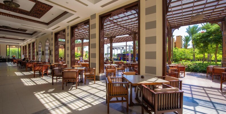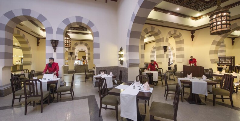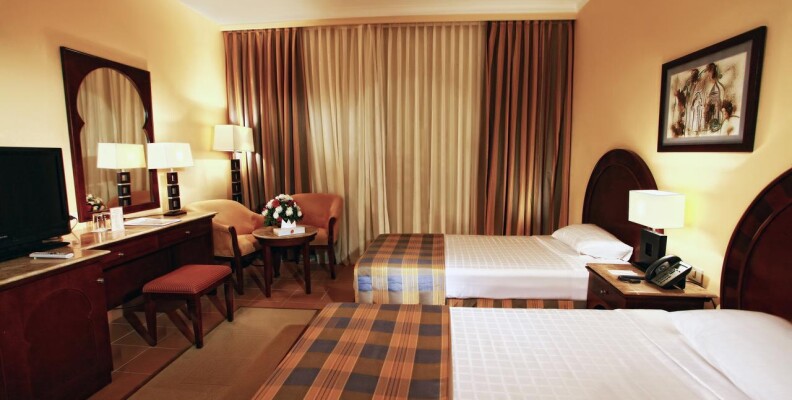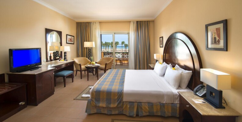 Приехали мы туда во второй половине дня, расселили нас сразу же. Хочу сказать, что по правилам заселяют в номер после 14:00, так что для тех кто приезжает раньше, частенько приходится «погулять» до заселения. Номер у нас был самый ближний к морю, мне он очень понравился, вечерами тихо не слышно шума от анимации. Вид у нас был на море, очень порадовало. Сам номер хороший, сантехника исправно работала, мебель как в большинстве египетских отелей пошарпанная, в номере бесплатный сейф. Нареканий по уборке небыло, молодцы, стараются. Минибар пополнялся водой ежедневно без напоминаний. Питание в отеле хорошее, всегда было из чего выбрать, множество видов мяса, салаты все свежее, хорошая выпечка. Детское меню. Побывали во всех ресторанах Аля карт, при заезде дают несколько бесплатных посещений. Все рестораны хорошие еще очень понравилось , что во всех хорошее обслуживание, приятная атмосфера. Что не могу сказать о главном ресторане. Столы убираются не своевременно, что порой очень сильно напрягало. Приходилось бегать за официантами просить чтобы убрали стол.