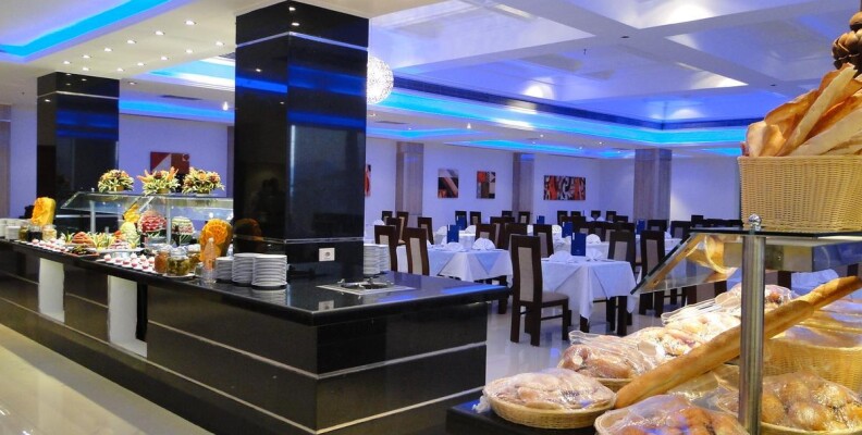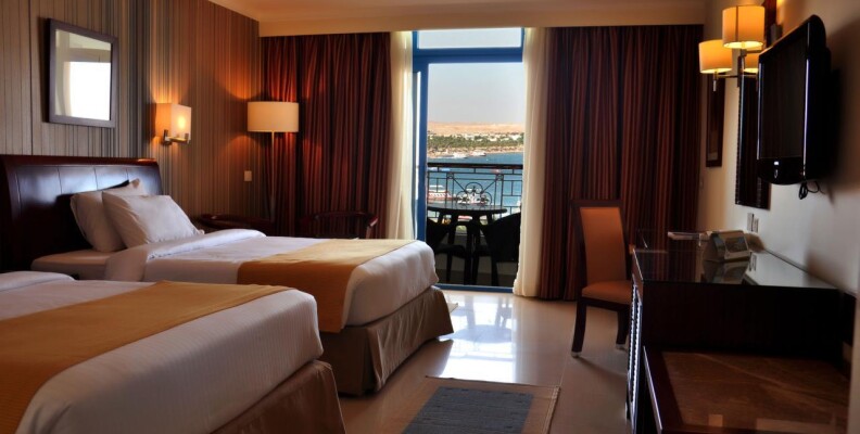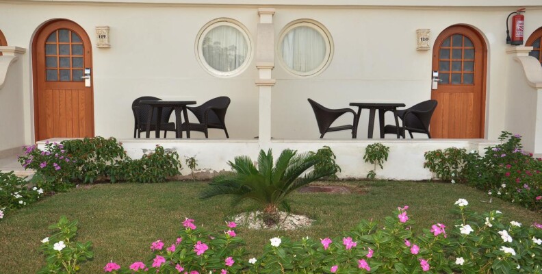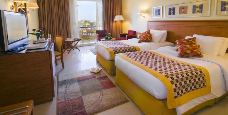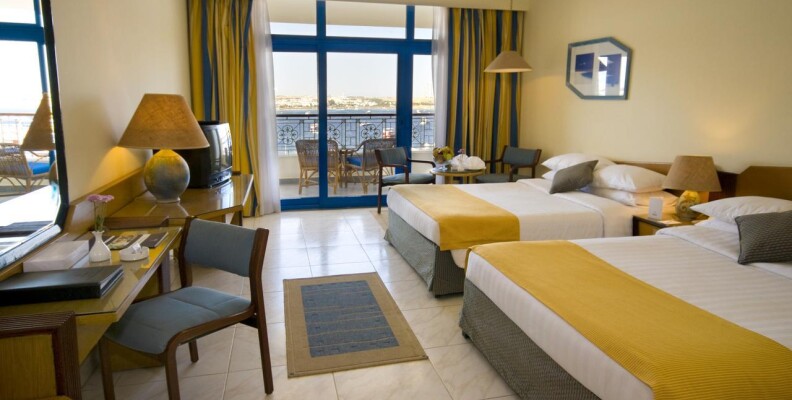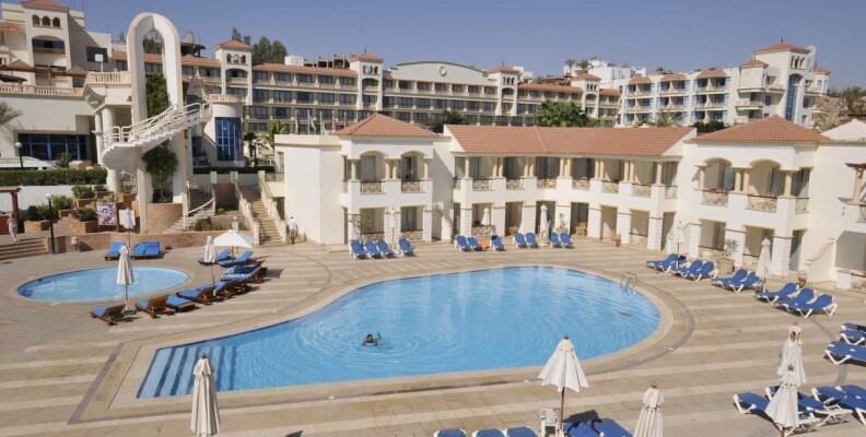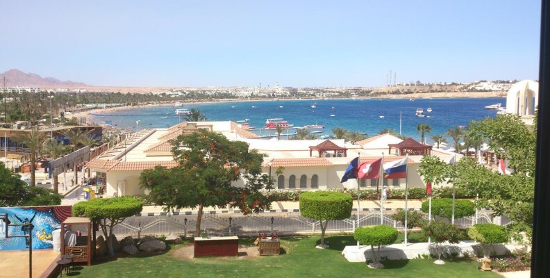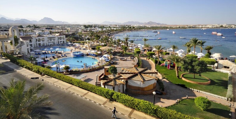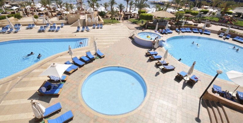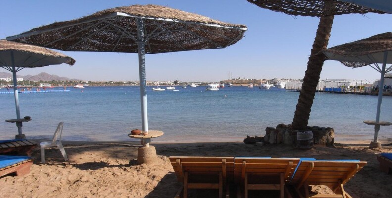 Привет всем!Отдыхала в этом отеле с 15.09.12 по 24.09.Впечатления не очень.От аэропорта отель расположен недалеко,примерно 30 мин,с учетом того,что еще завозили туристов в др.отели по дороге,наш отель по маршруту был последний.Заселили сразу(т.к было уже 14.30),а заселение всегда идет после 14.00.Номер с видом на море(т.к за это мы заплатили еще в России),но прямо напротив сцены для анимации,так что,кто едет с детьми или любит тишину по вечерам,будет очень шумно.Мы на ресепшене попросили поменять номер,они согласились,но сказали нужно заплатить(один наглый араб на ресепшене сразу сказал каждый день будет стоить 20 долларов,но второй понял,что его друг перегибает палку,сказал,что будет стоить гораздо дешевле) предложили только один вариант-1-ый этаж и вид на дорогу.Больше ничего не было предложено,т.к в это время приехало много арабских семей.Их,конечно,нужно было расселить по лучшим номерам.Мы решили остаться в своем номере.Стандартные номера довольно маленькие(наш был без балкона)очень маленькая ванная+ко всему этому совершенно непонятная стеклянная перегородка,наполовину закрывающая душ(от этого вода все время на полу около раковины,после принятия душа).Кондиционер и холодильник не работали.Вешалка в шкафу для одежды тоже сломана.Правда,после заявки на ресепшен,все сразу починили.Еда нормальная,голодными не были.Каждый день мясо,курица.Рыба была редко и невкусная.Салаты(не всегда свежие,пахли иногда кислым)Будьте с ними осторожны,я кстати,очень сильно отравилась чем-то,потом после отравления желудок болел 3 дня.Фруктов нет,только кажд.день салат(дыня+яблоко),Выпечка многообразная и вкусная,супы.Чай еще пить можно,а вот кофе отвратительный.Из алкогольных напитков только пиво и противный ром,водка.Бар только на пляже,остальные бары в отеле платные.Воду в бутылках покупали в маркете.Потому что если вы хотите пить,можно воду взять только в баре на пляже(ее наливают в малюсенькие стаканчики)1-ый раз такое вижу!Неужели такая проблема с водой!я понимаю,если это было бы 3 звезды!Пляж небольшой,но лежаков хватало всем,но они неудобные и не регулируются.Анимация идет целый день,ребята-аниматоры молодцы,не дают скучать.Очень часто по вечерам живая музыка,всякие шоу,с утра зарядка,аквааэробика,дартс.Заход в море удобный,дно песчаное,но очень мало кораллов(расположены справа,ближе к мостику),очень много яхт и лодок,поэтому за линию буйков заплывать опасно,носятся как сумашедшие.Еще плюс на этот пляж приходят посторонние арабы,которые также плавают с масками на рифе,и если видят,что девушка плавает одна начинают преследовать в воде,это очень сильно напрягает.Также плюс отель расположен в самом центре Наама-бей,магазины все рядом.И хочу вам сказать,друзья,если не особо заморачиваться,то отдохнуть можно,но отель тянет на троечку!