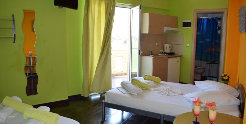 Это очень хороший отель, где можна чувствовать себя как дома, потому что есть собственная кухня с холодильником, электрической плиткой и необходимой посудой. Это довольно тихая зона, не очень далеко от центра города (в пешей доступности около 15-20 минут). Есть очень хороший минимаркет в 5 минутах, где вы можете найти практически все, что вам нужно, и цены так же дешевые, как в супермаркете. Пляж - в 7-8 минутах от отеля. Персонал хороший, номер чистый и светлый в стильных тонах с балконом, так что это отличное место для остановки за очень доступной и выгодной ценой. Внешний вид отеля миленький, недалеко находится дорога, но надеюсь хозяева немного его возобновлят, но во всем хорошо. На первом этаже, находится рецепцыя, сам отель двухетажный, небольшой, а отдых получился економный и приятный.