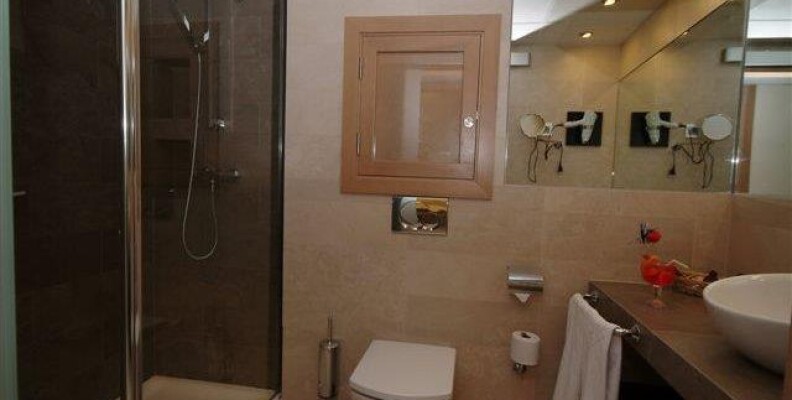Мы брали номер супериор. с огромным балконом (стол, стулья, лежак), две комнаты: спальня со шкафом-купе, тумбами, телевизором, двуспальной кроватью, креслом, столиком и гостиная с двумя диванчиками, кухней (где есть всё, что только можно придумать), креслом, столиком, обеденным столом, телевизором, санузел с душевой. Всё чисто, красиво, удобно.