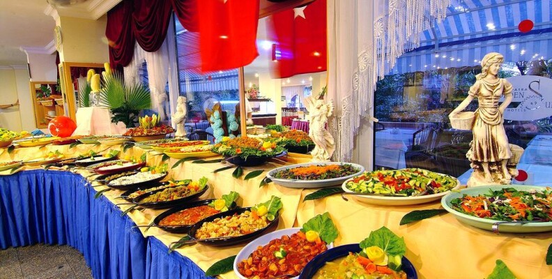 Еда: Как и во всей Турции, большая проблема с мясом: все сосиски и колбасы - соевые, свинину и говядину не дают – только рыбу и курицу (для справки: килограмм свинины стоит в Турции 80 долларов!). Было много тушеных овощей и свежих салатов, сыров, лепешек, а вот с фруктами тоже как-то не ахти: в наш заезд давали только яблоки, порезанный дольками грейпфрут и мелкие неспелые абрикосы. Все остальное: персики, черешню, дыни – мы покупали на уличном лотке возле отеля «Алладин». Налегать на местные бесплатные соки тоже не советую, потому что в них нет абсолютно ничего натурального: все они – что-то вроде разведенной из пакетика «Цевиты» или «Юппи». А вот пиво и белое вино вполне приличные.