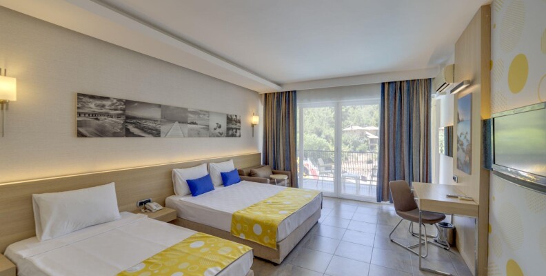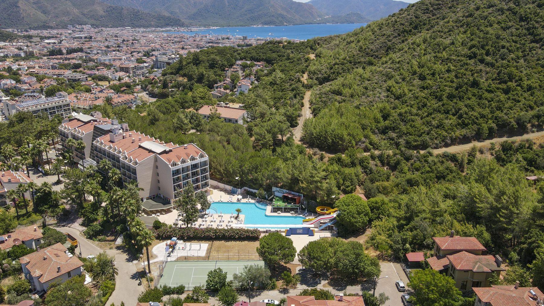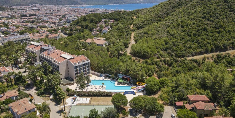 Мы сегодня прилетели из Турции. Хочу сказать что отдых удался Мы мечтали побывать на ПАМУККАЛЕ и поэтому выбрали Мармарис т.к. это город ближе всего находится географически к этому чуду Турции.Экскурсия замечательная и г.Мармарис тоже отель выбирала не дорогой но была приятно удивлена номера уютные мебель новая, кухня тоже порадовала Недостаток в том, что на рецепшене никто не говорит по русски приходится объясняться жестами и на ломанном английском.Вообще там отдыхающих русскоговорящих наверно 30% в основном англичане, немцы. Анимация есть но мне не хватало аква-аэробики .((( Что касается моря до одного берега идти,мы засекали 30мин! На другой более удачный пляж возит автобус от отеля расписание составлено так, что вы целый день загораете и купаетесь при этом пропускаете обед, мы назад возвращались раньше сами на маршрутке. В отзывах пишут что рядом кладбище если бы я не знала я бы его и не заметила оно огорожено забором, но еще слышала, что видно с некоторых номеров у нас был удачный номер вид выл на город. Еще хочу отметить, что там есть аппартоменты это двухуровневые номера со стиральной машинкой. По сравнению с соседними отелями наш не находится у дороги, территория маловота но всё в зелени есть бассейн и две горки, для малышей отделены лягушатники. Цена на мой взгляд соответствует качеству.Желаю всем приятного отдыха!!!)))